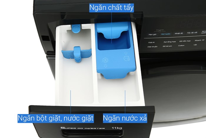 - Giặt hơi nước: hơi nước và bột giặt được khuếch tán bên trong lồng giặt ở nhiệt độ 60°C đến 90°C giúp thẩm thấu vào quần áo tốt hơn, nhanh chóng loại bỏ các vết bẩn cứng đầu, đồng thời giúp loại bỏ vi khuẩn và các chất gây dị ứng, an toàn cho da nhạy cảm.