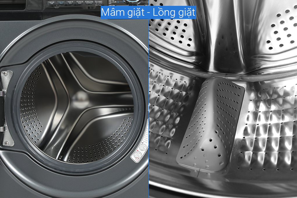 - Lồng giặt được làm từ thép không gỉ giúp quần áo được sạch hơn, ngăn ngừa vi khuẩn có hại và tăng độ bền cho máy giặt.