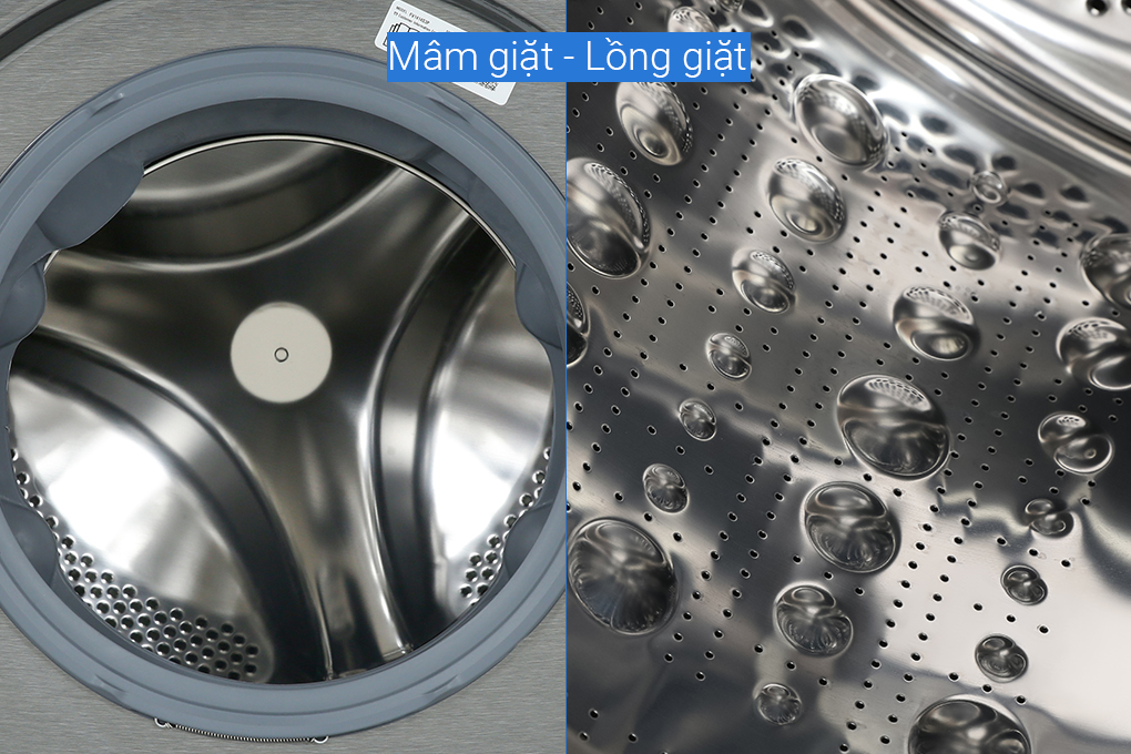 - Lồng giặt bằng từ thép không gỉ sáng bóng, hạn chế mảng bám và gỉ sét trong quá trình sử dụng.