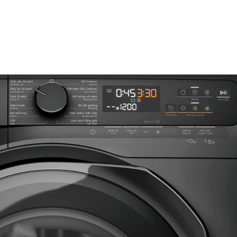 Bảng điều khiển song ngữ Anh - Việt kết hợp núm xoay và màn hình cảm ứng TFT hiện đại hiển thị rõ ràng các thông số như thời gian giặt, chương trình giặt và các chế độ bổ sung. Thiết kế này giúp việc thao tác trở nên dễ dàng, kể cả với những người lần đầu sử dụng máy giặt lồng ngang.
