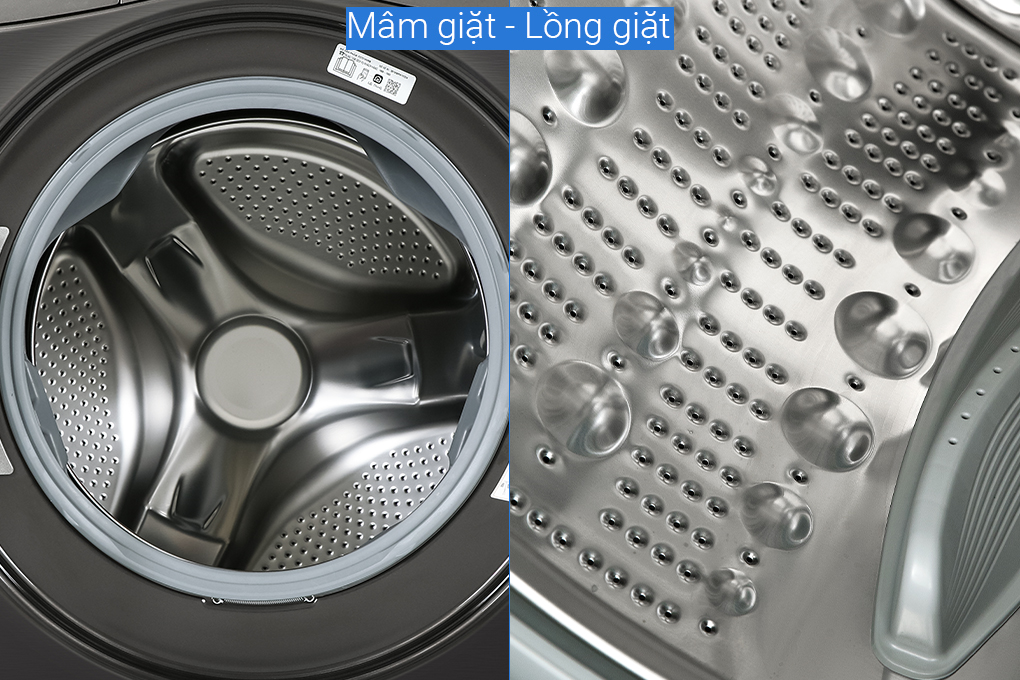 - Chất liệu lồng giặt được làm bằng thép không gỉ sáng bóng và có độ bền cao, góp phần nâng cao hiệu quả giặt sạch quần áo trong suốt quá trình sử dụng.