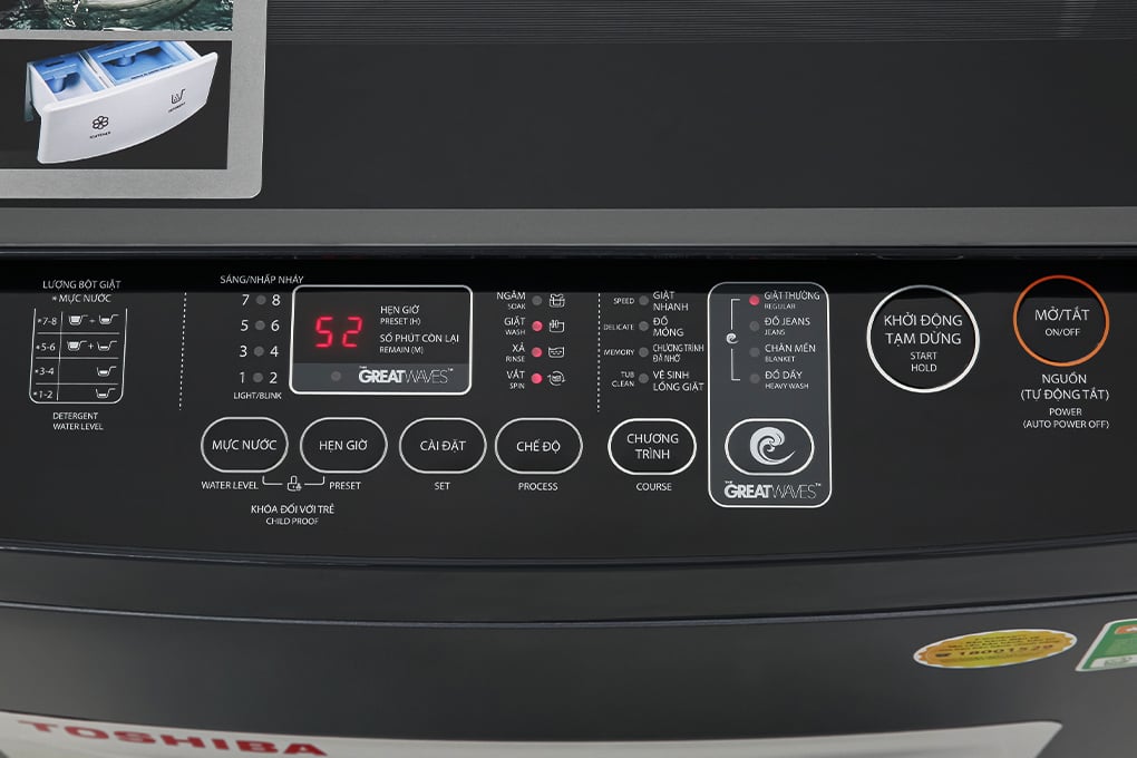 - Công nghệ suy luận ảo Fuzzy Logic: Hỗ trợ máy giặt Toshiba 9 kg này có thể tự động cân chỉnh được lượng nước và thời gian theo khối lượng đồ giặt có trong lồng giặt, từ đó sử dụng điện và nước hợp lý mà vẫn đảm bảo hiệu quả giặt sạch.
