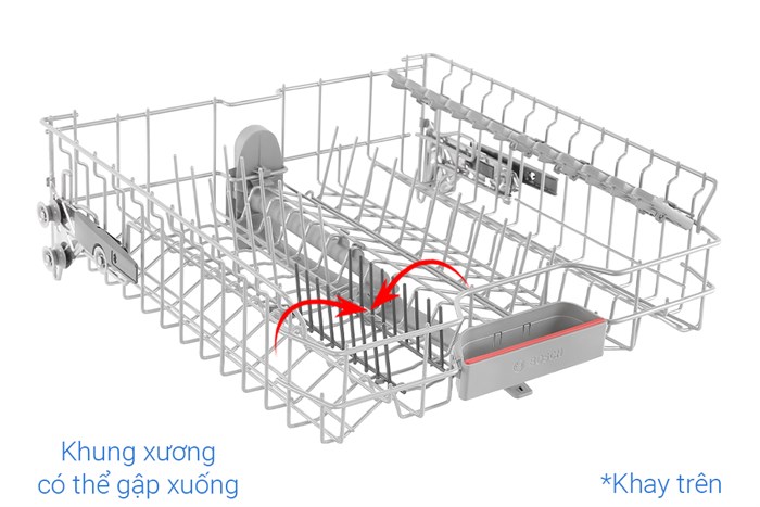 - Mẫu máy rửa chén Bosch này có thiết kế khung xương khay dưới linh hoạt, người dùng điều chỉnh để đặt các vật dụng kích cỡ khác nhau dễ dàng.