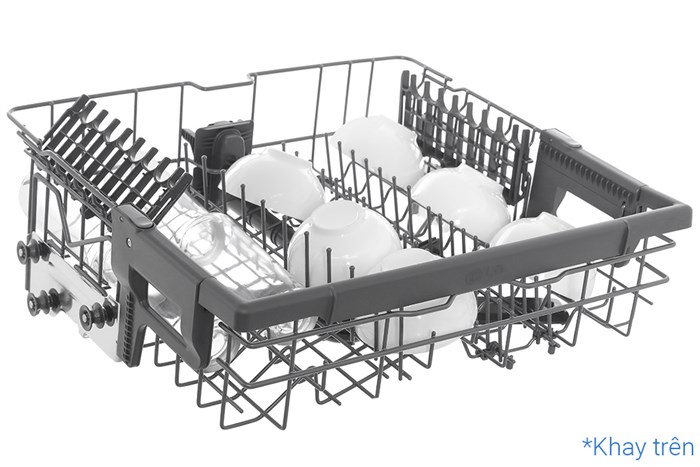 - Máy rửa chén LG này được thiết kế bên trong gồm có 3 khay rửa: khay dao muỗng, khay trên và khay dưới.