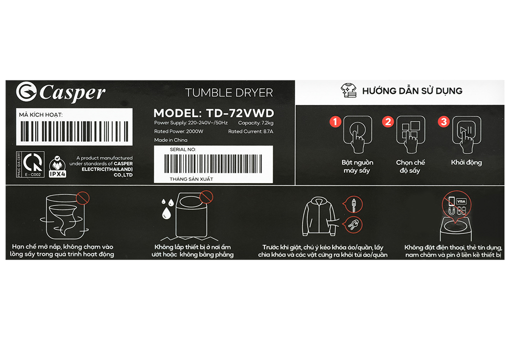 Máy sấy thông hơi Casper 7.2 Kg TD-72VWD với chức năng Refresh - loại bỏ mùi hôi, nấm mốc, giúp quần áo được khô ráo, thơm tho cùng cơ chế sấy đảo chiều giảm nhăn hiệu quả, giảm thiểu thời gian là ủi sau mỗi lần sấy sẽ giải quyết được nhu cầu làm khô quần áo cho những gia đình có từ 2 - 3 thành viên.