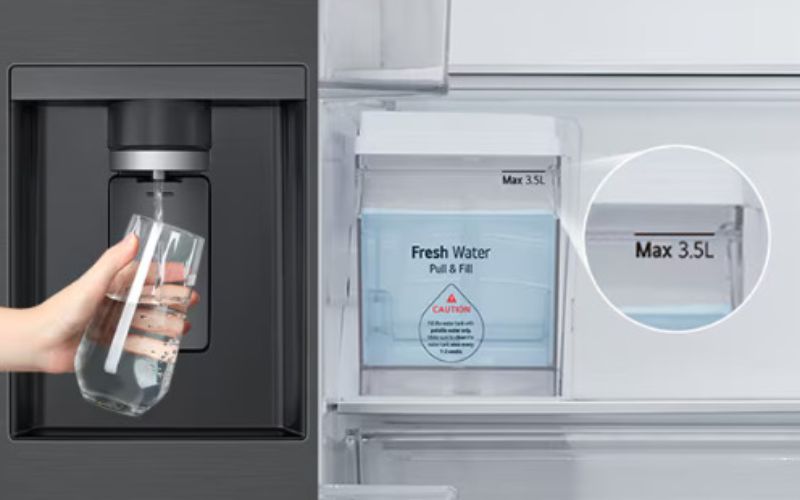 Ngăn lấy nước mát bên ngoài tiện nghi, người dùng chỉ cần nhấn cần gạt ngay trên cánh cửa tủ lấy nước mát uống nhanh chóng hơn, không cần mở cửa, hạn chế thất thoát hơi lạnh nên tiết kiệm điện năng tốt hơn.
