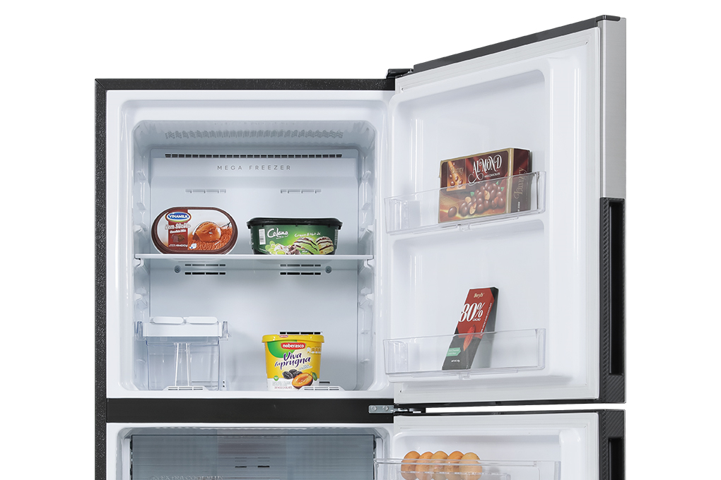 - Phần ngăn đá có một kệ khay đá để ngăn ra làm đôi, tiện lợi hơn trong quá trình bảo quản và sắp xếp thực phẩm. Có hộp đá xoay có thể dễ dàng làm các viên đá nhỏ và bỏ ra ngoài khi cần tăng không gian lưu trữ. Phần cánh tủ có thêm khay đựng để đồ tiện lợi.